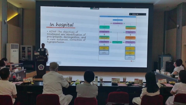 本次讨论的病案题目为《行到水穷处-心力衰竭的诊治》,针对一例慢性心力衰竭急性加重,合并主动脉瓣疾病、陈旧性心肌梗死及肾功能不全的患者的诊疗过程进行了深入探讨。在张岩老师的指导下,首先由三年级住培医师李可通过SOAP格式详细分享病历,而后针对诊疗过程进行讨论,讨论会针对不同年级、不同层次的住院医师,设置了不同层次的讨论问题,涉及急性心衰合并肾功能不全患者肾功能不全病因分析、利尿剂的使用、容量管理、抗生素选择、连续性肾脏替代治疗(CRRT)时机的讨论,并对心衰患者出院后长期随访与管理问题进行了探讨。留学生Hytham Alsamawi不仅全程参与了讨论,还深入分享了他对急性心衰患者诊疗流程及管理策略的独到见解。他详细阐述了急性心衰患者的治疗方案,包括药物治疗、机械通气支持等,并强调了在治疗过程中应如何根据患者的具体情况调整治疗方案,以达到最佳的治疗效果。参会住院医师在讨论前进行了充分准备,复习了大量文献和指南,讨论过程中展现出了极高的热情和活跃的思维,体现了交大二附院住院医师扎实的临床能力和良好的精神风貌。