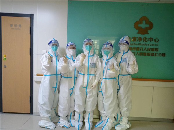 看到其它队员顺利为6天未透析的阳性患者进行了CRRT透析治疗,超滤5公斤,喘息声明显改善,精神状态比上机前改善了很多,看到一个个血透患者及时得到有效救治,我们内心充满了力量。我们一定牢记使命、不负重托,与上海人民同舟共济、共克时艰,在做好自我防护的基础上尽心尽责完成医疗救治工作,全力以赴援助上海打赢疫情防控攻坚战,绝不辜负上海和家乡人民的期待和重托。