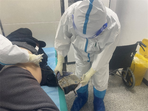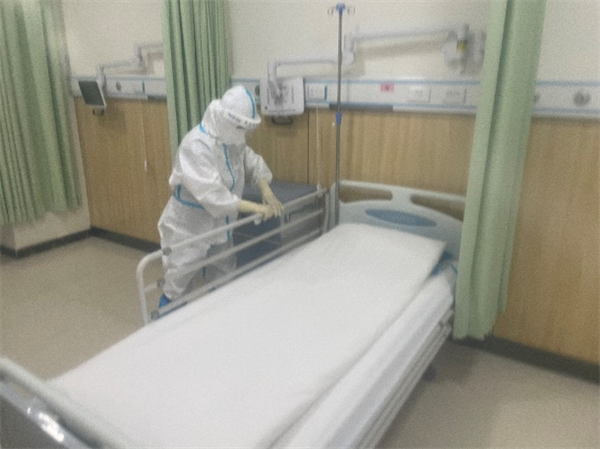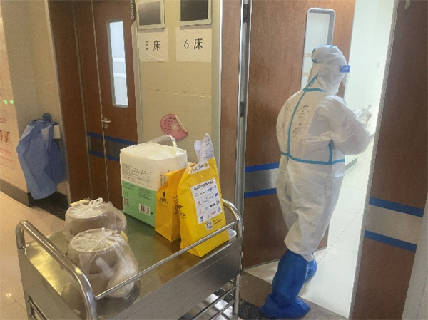 护理组的工作在王园护士长的安排下也在有序开展,由于感控工作的要求,患者和家属不能随意出病房,护理工作除了要进行日常治疗外,还要承担起“服务员”的工作,为患者打热水和送餐,让患者在这特殊的情景下有尽可能舒适的就医体验。