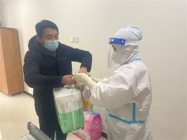 护士为患者送饭和发放生活用品