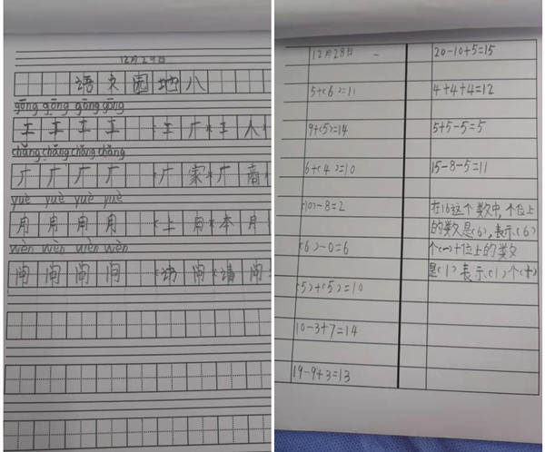 第二日,医生晚查房时姥姥说小男孩有点儿闹情绪,哭了好几回。追问原因才知道,小小年纪的他不仅担心妈妈的病情,还因为来医院耽误了上课,为不能完成作业而着急。发热单元的医护人员得知小男孩的情况后,连夜开通了发热单元的网络,李燕玲医生和马乐护士长为其赶制了生字本和低算本,并准备好铅笔和橡皮。