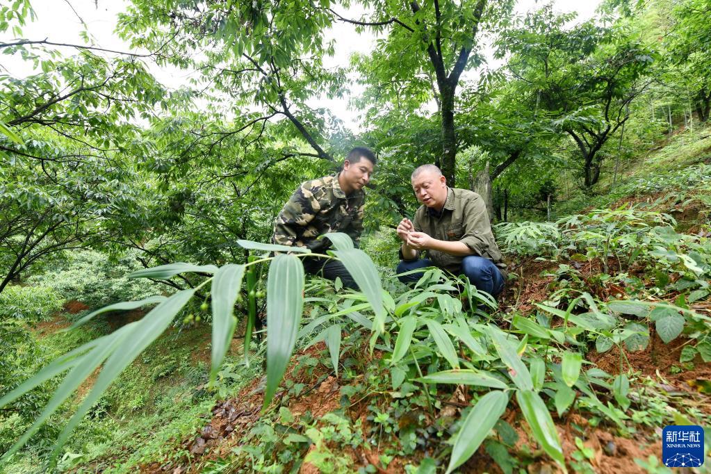 福建建瓯市林权改革发展服务中心的科技特派员陈国兴(右)在建瓯市玉山镇上房村一处林下种植园给村民讲授中药材栽培方法(5月28日摄)。新华社记者林善传 摄