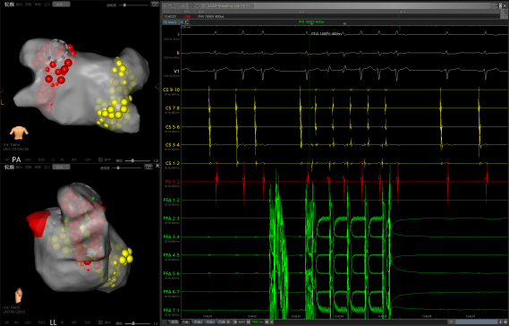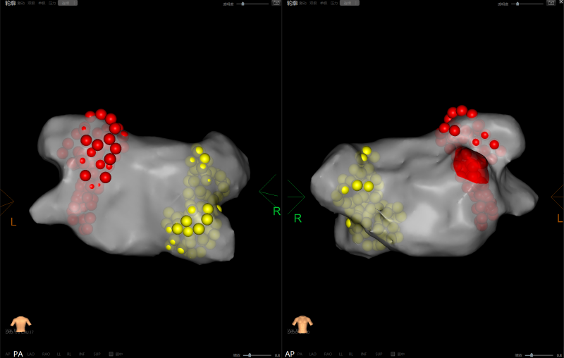 在手术直播环节,王洪涛教授及其团队均采用绿色电生理技术,无射线实现消融。第一例case为房颤射频消融加左心耳封堵手术演示。患者为老年男性,长期受房颤困扰,生活质量严重下降。经过详细的术前评估和准备,决定为患者实施房颤射频消融加左心耳封堵一站式手术。在Carto3三维标测系统的导航下,完成左心房的三维建模,精准定位后成功完成射频消融治疗,并进一步完成左心耳的封堵术,更大的改善和保障患者的预后。