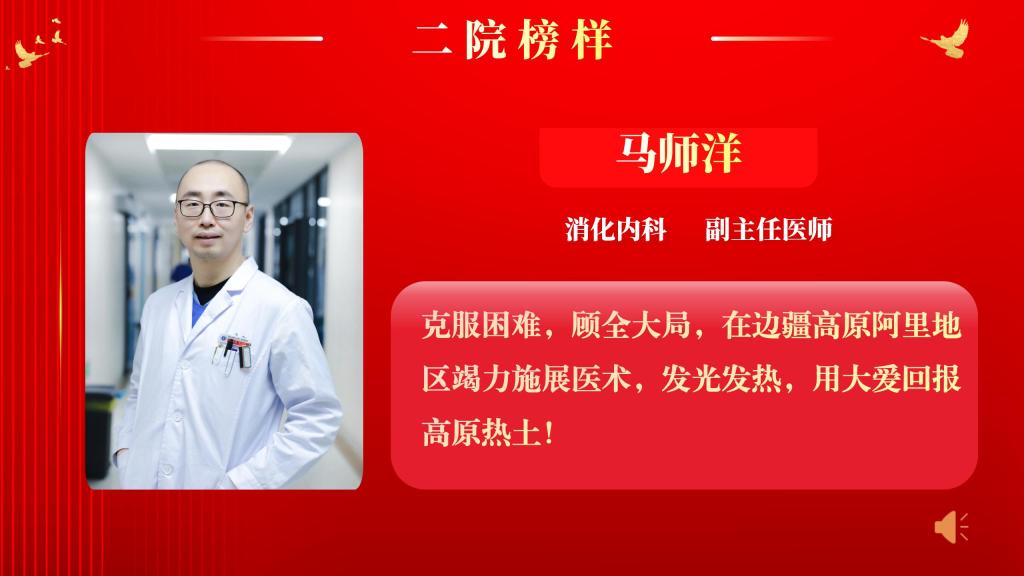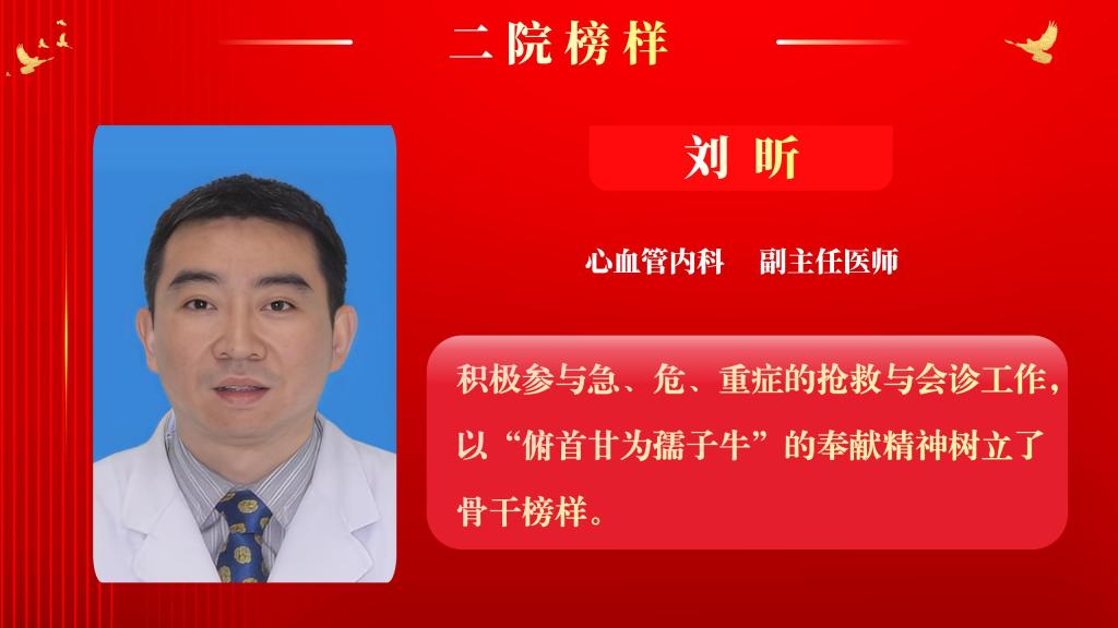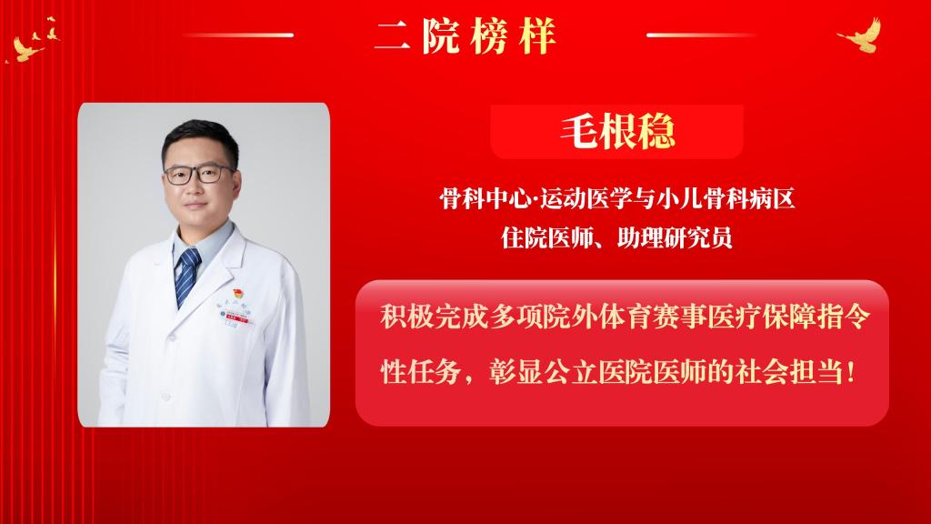 本次评选主要围绕三甲复审、医疗质量安全、国科金申报等医院近期重点工作,经部门提名、组织审核、评审工作组联评与院工会研究讨论通过,共产生了“二院榜样”月度人物10名。他们分别是:消化内科副主任医师马师洋,皮肤科副研究员车德路,骨科中心·运动医学与小儿骨科病区住院医师、助理研究员毛根稳,心血管内科副主任医师刘昕,医学影像科副主任医师刘强,中医科主管护师李金娥,老年内分泌代谢/呼吸科(干三病区)主管护师吴冰,乳腺疾病诊疗中心主治医师、副研究员赵永林,超声医学科住院医师黄丽丽,肿瘤内科主治医师、副研究员韩丽丽。