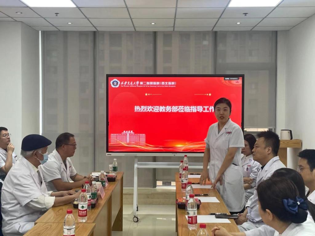 随后,邓捷主任代表全科向教务部一行进行了教学工作汇报。他首先回顾了科室在教学工作领域取得的显著成绩,特别是获得的多项教学竞赛奖等荣誉。他详细描述了科室在教学队伍建设、教学设施配置、教学课程设置等方面的具体举措,并重点突出了科室在教学改革和创新方面的积极探索和尝试。邓主任的汇报内容充实、条理清晰,得到了教务部一行的高度评价。