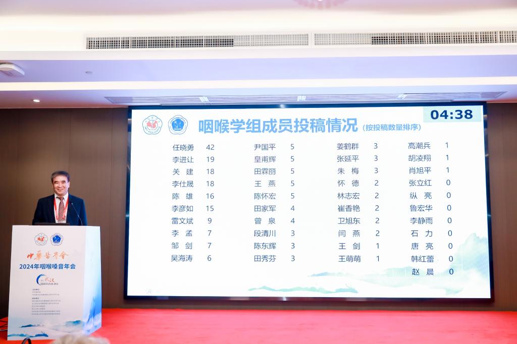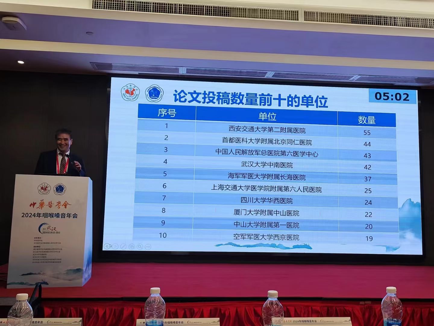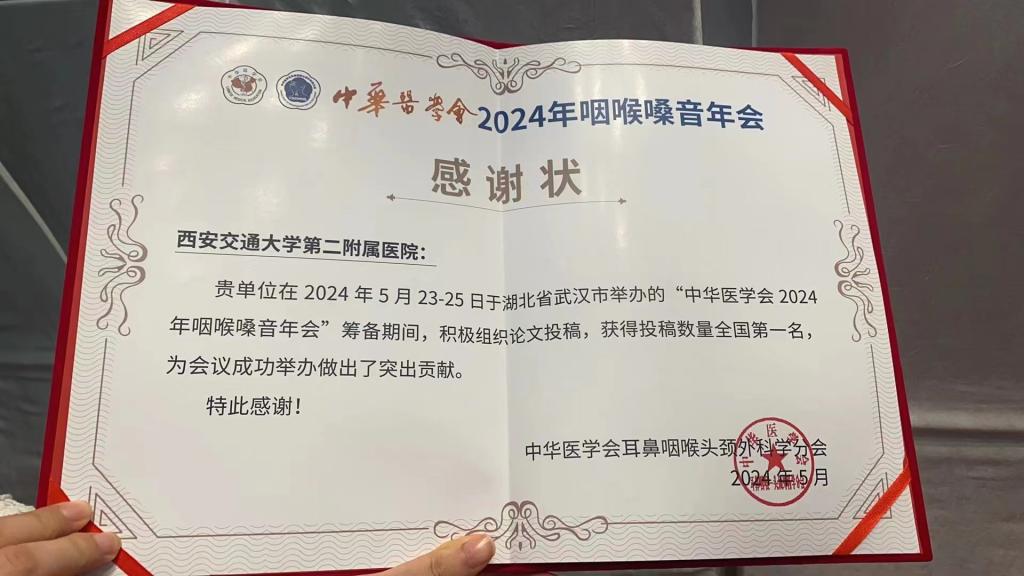 中华医学会耳鼻咽喉头颈外科分会委员、咽喉学组副组长、西安交通大学第二附属医院耳鼻咽喉头颈外科任晓勇主任带队参加本次会议。本次会议中,我科共投稿55篇,总数位列全国第一,包括咽喉方向42篇,嗓音方向9篇,护理方向4篇,再次展现我院耳鼻咽喉头颈外科的学术实力。