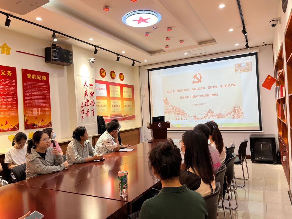 5月27日,西安交通大学第二附属医院2022级硕士研究生党支部与来自浙江大学、西北大学、四川大学以及电子科技大学的党支部联合开展了以“师生共学《中国共产党纪律处分条例》”为主题的联学联建活动,电子科技大学罗大明教授进行了主题宣讲。