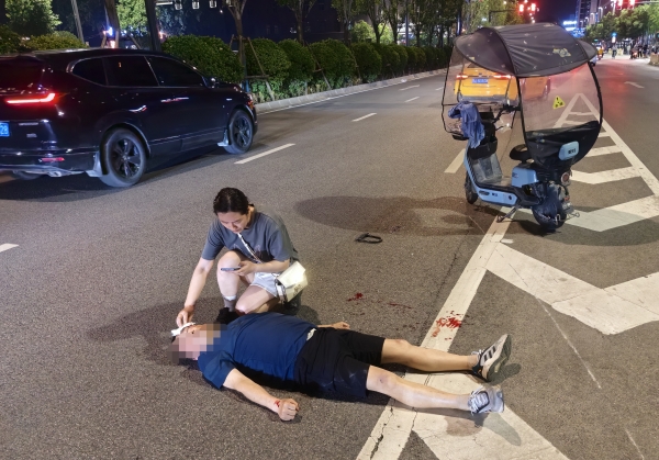 5月26日晚9时52分,自强东路发生一起交通事故,一名中年男性在骑电动车由东向西行驶时不慎撞上路沿石,重摔在地,头部血流不止。在这危急时刻,西安交大二附院护士刁攀恰巧路过,她迅速奔向事发现场,展现出了医护工作者的专业与担当。