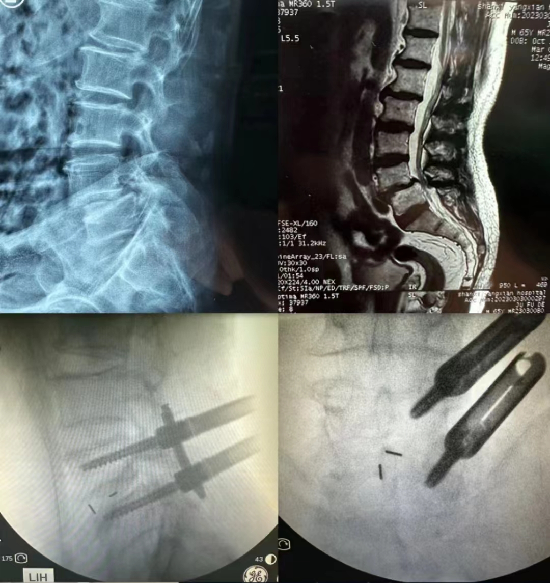 患者男,66岁。右小腿后侧疼痛1年半,平时走路只能走一段歇一段,对正常生活影响很大。洋县人民医院周伟医师接诊后,和刘颖主任、我院对口支援医师郭帅博士详细评估病情,发现该患者系腰椎滑脱合并椎管狭窄,具有手术指征,但患者提出能否采取微创手术的意愿。考虑到该院尚无开展腰椎滑脱MIS-TLIF手术的相关经验,遂联系到脊柱与骨肿瘤病区。经王栋主任安排,蔡璇副主任应邀主持协作团队针对患者病情进行了远程会诊讨论,设计出最佳手术方案,并制定了详细的术前、术中及术后风险情况应急预案。蔡璇副主任第二天上午在我院结束门诊工作后,便马不停蹄赶赴洋县,顾不上饮食和休息,一头扎进手术室。