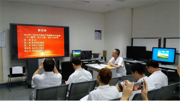 在学校及院党委开展“两学一做”的活动中,认真学习及理解党章党规,学习系列讲话,是党支部建设、精神文明建设和思想政治工作的重点内容。7月12日,医学影像与核医学科党支部付建设书记为支部全体党员上了一节严肃而又生动的党课。其主要内容是如何准确精读党章。在学习党章的重要性与逐字逐句通读党章党规的基础上,还重点解读一些名词,包括“两学一做”、“三会一课”制度、“四风”、党的纪律处分条例、廉洁自律准则及党的十八届五中全会的五大发展理念等。支部书记运用理论联系实际、身边实例等方式为大家答疑解惑。每位党员都感到这次党课开展与学习是“及时雨、雪中炭”。支部书记围绕我们所在党支部的实际情况,让大家认清合格党员的世界观、人生观和价值观,真正知道“两学一做”的时代内涵和要求。面对我们国家所处时代需要与动荡的世界大环境,大家通过此次党课的学习更加热爱我们的祖国,拥护党,对党忠诚,希望在我们党领导下的祖国繁荣昌盛,我们的医院秉承传统、彰显特色、成为国内一流,国际知名的医院。