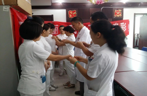 为了积极响应院团委的号召,2016年7月22日中医科团支部在病区示教室举行了隆重的“团徽耀青春·奋斗最美丽”团徽佩戴仪式。此次活动由中医科团支部书记刘静主持,科室主任孙万森,副主任兼党支部书记吴喜利,宣传委员杨海霞,组织委员党慧敏及全体团员参加。