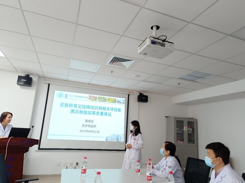 为了推进皮肤病院实验室检验项目的质控规范化,5月22日,皮肤病院耿松梅主任特别邀请了检验科耿燕主任、朱建宏副主任团队莅临皮肤病院实验室进行了现场指导与交流,由检验科董艳迎博士做了题为“皮肤科常见结缔组织病相关项目检测及检验结果质量保证”的主题报告。皮肤病院主任耿松梅、曾维惠副主任,检验科主任耿燕、副主任朱建宏,皮肤病院安金刚副教授,张燕飞、冯程住院总以及皮肤病院的医学检验人员等参加了本次交流会。