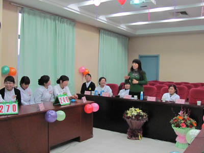 本次竞赛的主题是“手拉手共登知识峰,小智慧成就大智慧”。全科共有5支代表队参赛,每支代表队都有自己响亮的口号。天使队“团结拼搏,永创辉煌”;梦之队“相信自己,相信团队,勇夺第一”;进取队“进取进取,魅力无限”;拼搏队“努力拼搏,永争第一”;爱心队“知识竞赛,爱心最帅,魅力无限,所向无敌”。竞赛中参赛选手配合默契,踊跃参与,她们流利、准确的回答不断赢得观众和评委的阵阵掌声。通过个人必答题、小组必答题、抢答题、风险题、附加题五个环节的激烈角逐,最终天使队获得第一名,进取队和爱心队分获二、三名。