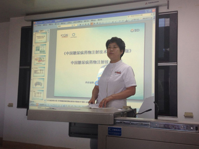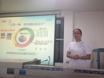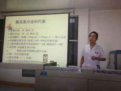 此次培训首先是邀请内分泌科副主任徐静教授,就糖尿病患者的胰岛素治疗进行了详细而精彩的讲解。徐静老师主要讲解了胰岛素的分类,常用剂型及作用时间,如何选用合适的胰岛素治疗方案,胰岛素的存放方法等,以多媒体的形式向大家充分阐述了胰岛素治疗的相关知识。她的讲课深入浅出,生动形象,让大家对胰岛素治疗有了全面的理解。并且简单讲述了2型糖尿病高血糖治疗路径、中国2型糖尿病综合控制目标等内容。