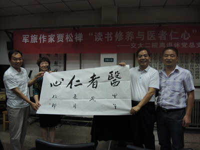 讲座结束,离退休职工管理办公室叶泽宇主任和党办赵振峰副主任从贾松禅老师手中接过他特意赠送给我院的一幅他自己的书法作品——“医者仁心”。该作品表达了他对我院悠久历史的敬仰和我院诸多白衣天使“医者仁心”的颂扬。随后,贾松禅老师与听讲座的部分党员干部合影留念。