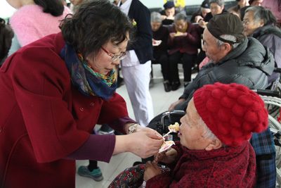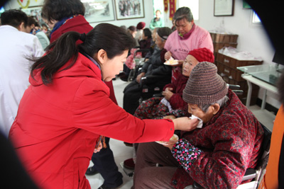 2014年3月1日,西安丰泽园老年公寓里一派欢声笑语,来自西安交大二附院等单位和团体的一批“白衣天使”和志愿者,来到这里为老人们做健康查体和义诊服务,表演节目,和老人们聊天,帮助公寓打扫卫生,并给老人们带来了美味的蛋糕、面包。陪伴老人们度过了美好快乐的一天。