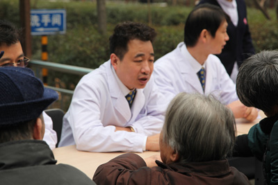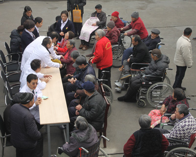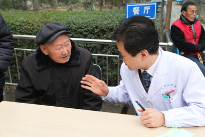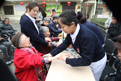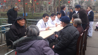 到达目的地“丰泽园”老年公寓后,党员们立刻分成了两批,一批在科护士长段艳霞的带领下去为那些常年卧床的老年人进行专业的护理指导;另一批在吉鸿、马建仓、陆宏伟三位副教授的领导下,为那些能自理的老人进行体检和健康咨询,解答平时遇到的健康问题,并对老人们进行健康知识的教育。义诊服务进行了近2小时。