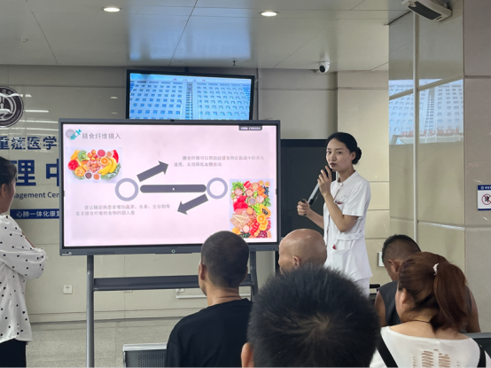 在讲座中,赵倩老师对糖尿病患者的饮食营养规划做出了详细的讲解。她讲到糖尿病患者应坚持均衡饮食,确保营养充足,同时有效控制血糖。建议每日适量摄入碳水化合物、蛋白质和健康脂肪,增加蔬菜、水果和全谷物的摄入。针对特殊情况下的饮食调整,赵老师指出:当出现低血糖(糖尿病患者血糖≤3.9mmol/L,正常人血糖≤2.8mmol/L)时,应及时补充含糖食物,如水果糖、果汁等,以快速提高血糖。面对并发症,如糖尿病肾病,应限制蛋白质和盐的摄入;若为糖尿病视网膜病变,则应增加富含维生素A和C的食物摄入。赵老师还强调,糖尿病患者应避免食用高糖、高脂肪、高盐和刺激性食物,如巧克力、动物内脏、腌制食品、咖啡、浓茶等。