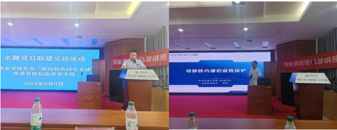 2024年9月9日上午西安交通大学第二附属医院肾病科副主任陈钊教授,贾利宁教授,赵莉护长,魏士卓医师,走进岚皋县医院举行第三届肾友会。开展血管通路专题科普讲座及内瘘筛查、疑难病例查房。透析室患者及全体医务人员参加。
