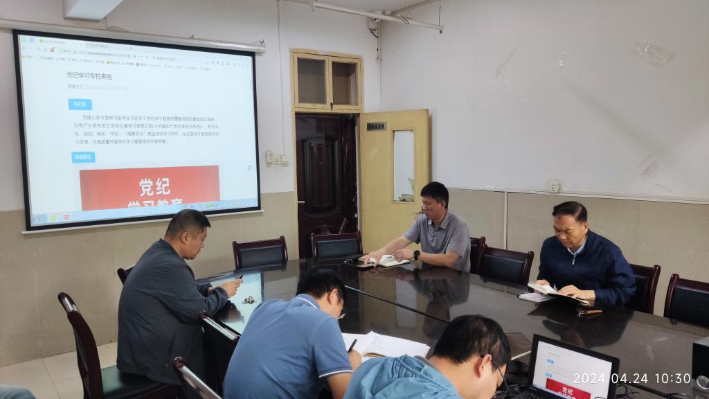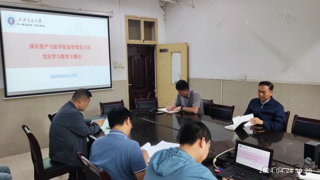 2024年4月24日上午10点20分,医院国有资产与医学装备管理办公室(以下简称国装办)党支部在国装办二楼会议室召开了党纪学习教育专题会。支部近20名党员及入党积极分子参加了学习会,会议由国装办党支部书记、主任叶泽宇主持。