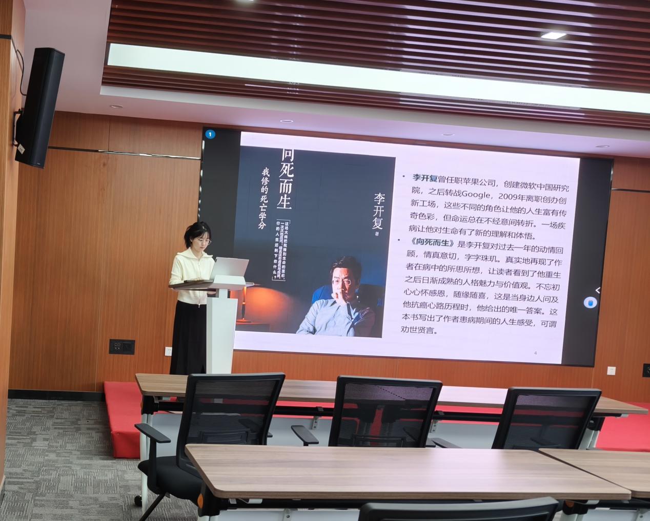 紧接着,学生党员白瑞敏为大家分享了李开复先生的《向死而生,我修的死亡学分》一书的精彩片段。通过白瑞敏的讲述,大家深切感受到了李开复在病痛中的坚韧与乐观,以及他重生后对生命和事业的全新认识。白瑞敏的分享不仅让大家对生命有了更深的思考,也激发了大家面对困难时的勇气和决心。