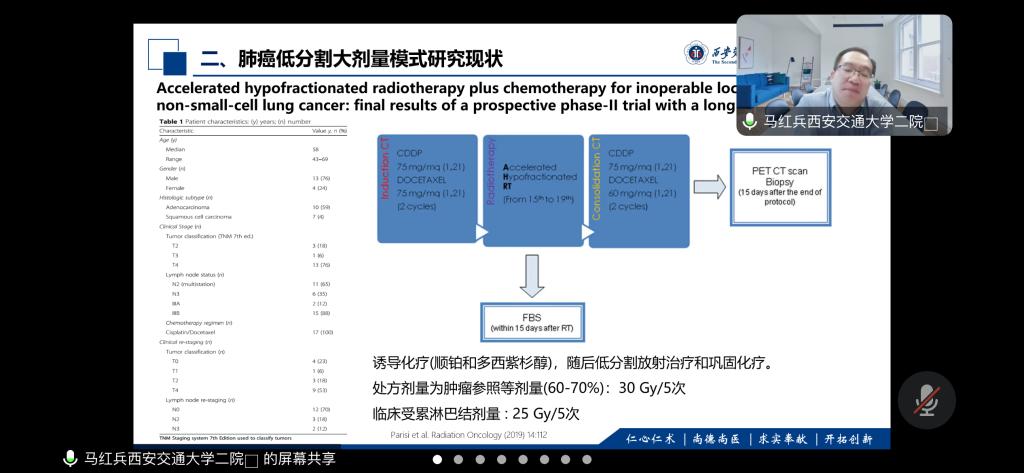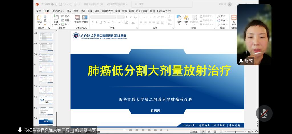 马红兵主任结合自己的工作经验和相关科研情况进行了《肺癌低分割大剂量放射治疗》的相关学术讲解。王敏聪主治医师根据自己的临床工作分享了《肺癌大分割放疗病例汇报》。华中科技大学同济医院的张莉教授、延安大学附属医院的赵红教授、西安交通大学第二附属医院杨侠教授则根据他们的专业知识,针对他们的内容进行了点评。