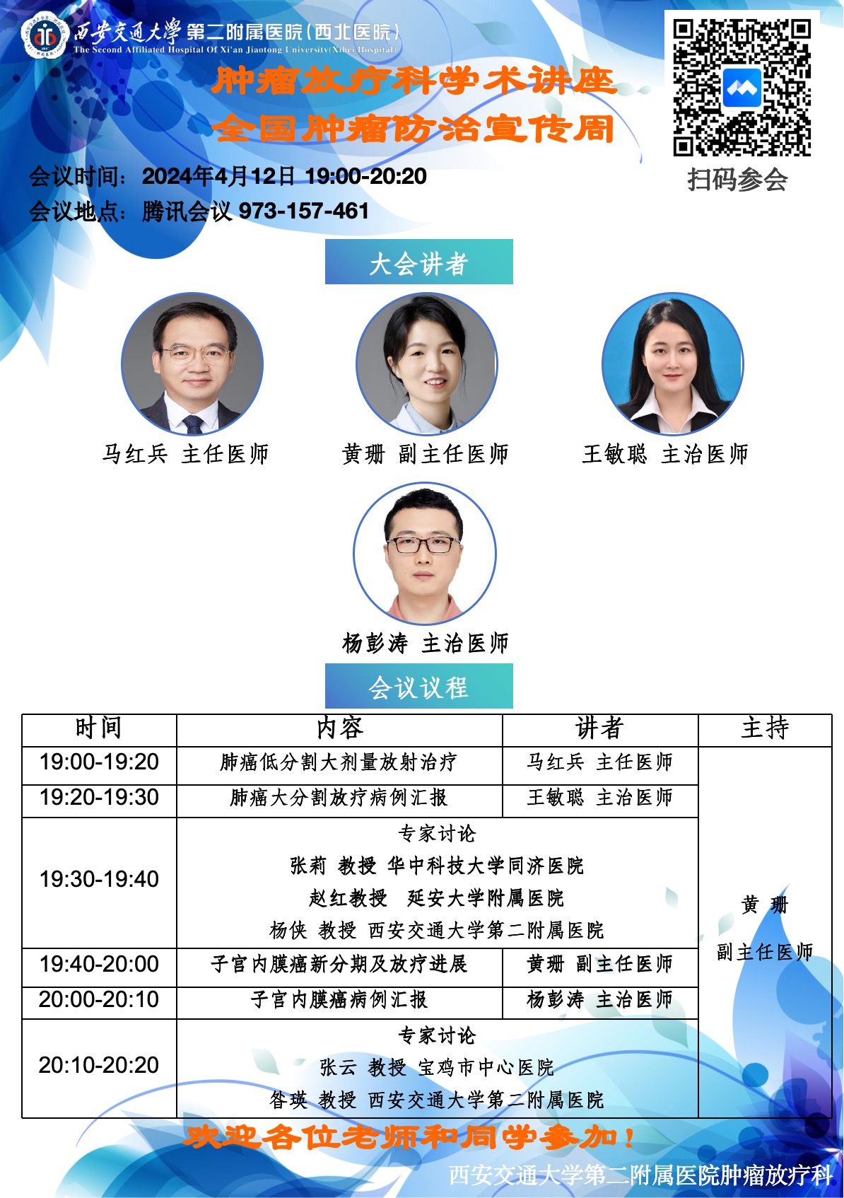 4月12日下午,肿瘤放疗科开展了全国肿瘤防治宣传周线上学术讲座。会议上,马红兵主任对来自华中科技大学同济医院的张莉教授、延安大学附属医院的赵红教授、西安交通大学第二附属医院杨侠教授、宝鸡市中心医院张云教授、西安交通大学第二附属医院昝瑛教授以及所有与会人员表示了热烈欢迎。随后,会议在黄珊副主任医师的主持下正式开始。