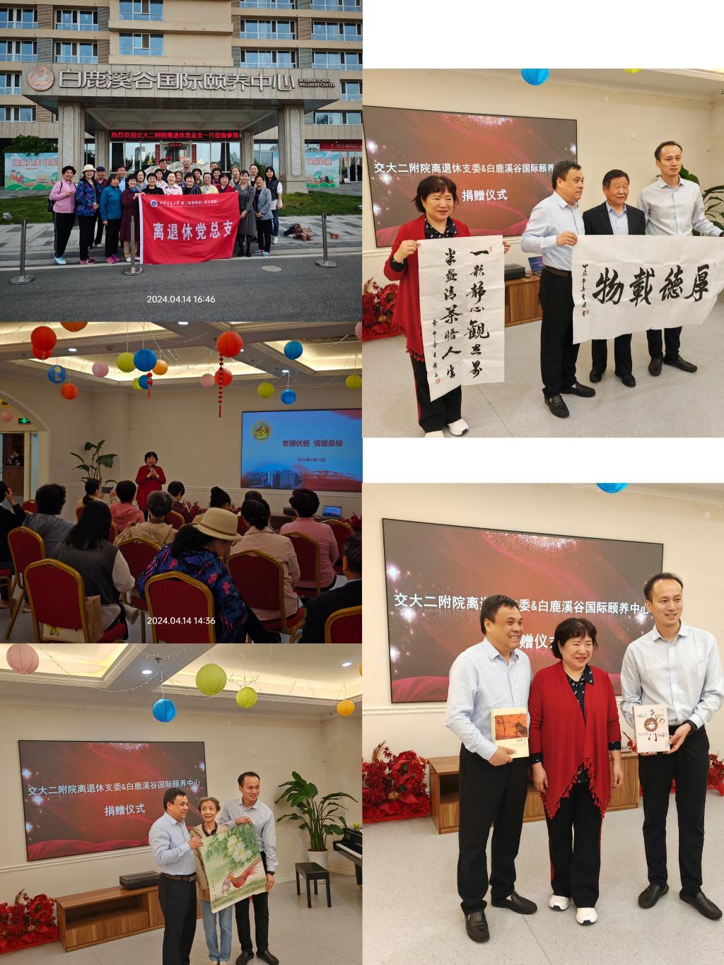 观影结束后,离退休党总支书记范亚利应邀为两个单位的同志分享了党课《老骥伏枥 情暖桑榆》,并详细讲解了国家最新的基本养老服务政策。接下来,举行了简短而热烈的捐赠仪式,为他们送去精神食粮。白鹿溪谷颐养中心副总经理和办公室主任代表中心,接受了我院退三支部书记杨杰老师赠送的工笔画,退一支委姜生礼教授赠送的书法作品,范亚利书记创作出版的长篇历史小说《西堡子》和《尧母门》。