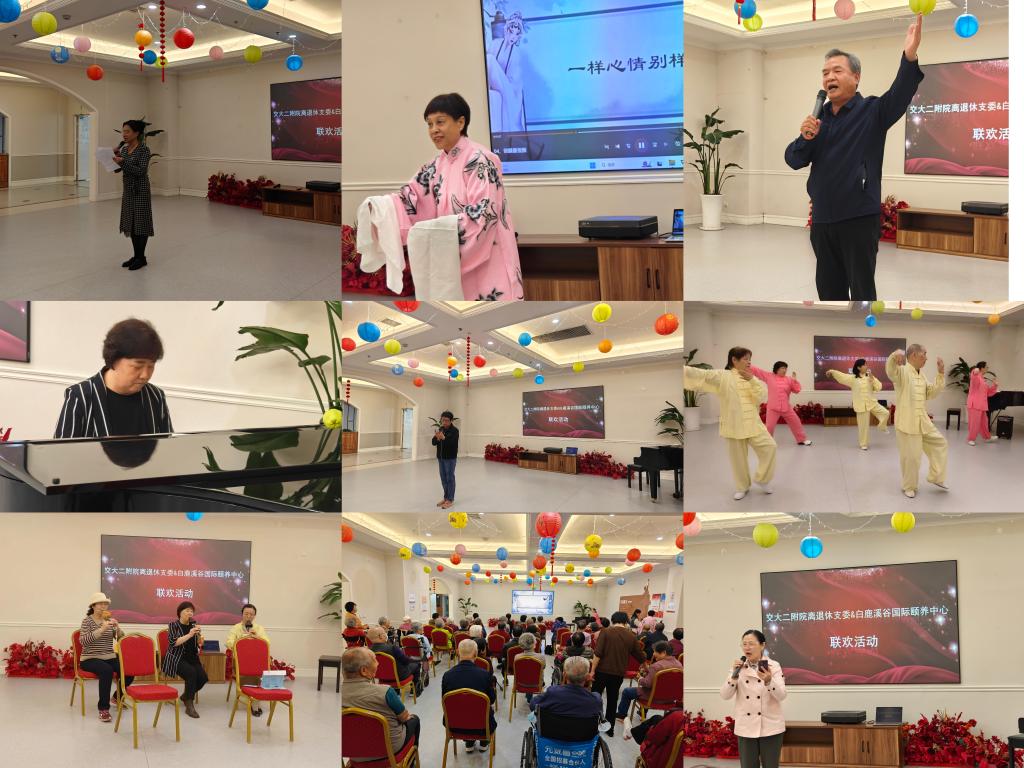 支委老师们与中心康养工作人员和入住人员联欢,由支部书记赵小荣主持了由支委老师们奉送的文娱节目。节目包括诗朗诵、健身太极拳、京剧演唱、葫芦丝、东北八角巾、独唱、钢琴独奏、秦腔清唱等,节目内容精彩纷呈,现场座无虚席,掌声阵阵,受到了康养人员的热烈欢迎。