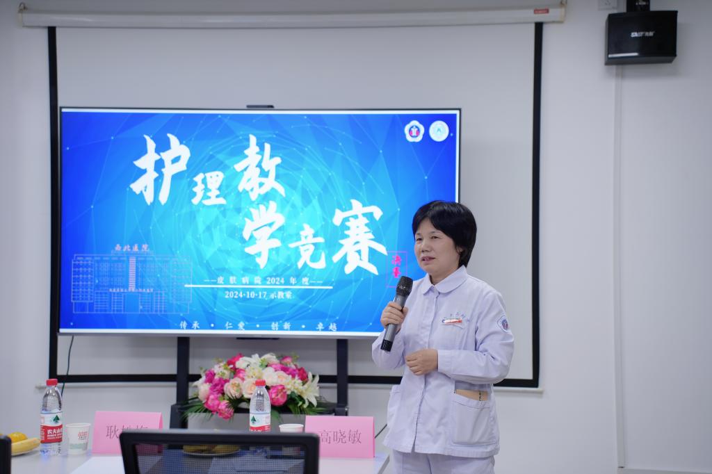 为进一步提升科室护理人员的教学水平和授课能力,在高晓敏护士长的组织下,皮肤病院护理部举办护理教学竞赛,本次竞赛历时一月余,共有19位选手参与,通过科室初赛选拔,最终10位优秀选手进入决赛。决赛于2024年10月17日下午在四楼示教室进行,担任决赛的评委有:妇儿传片区杨长虹总护士长、眼耳皮门诊社区片区王秀莹总护士长以及皮肤病院耿松梅主任、高晓敏护士长等资深专家,众多皮肤科护士也积极参与,共同观摩学习。