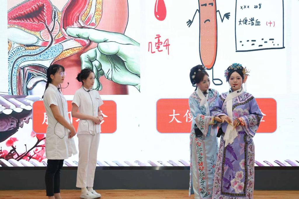 在比赛现场,普外科的医护人员以穿越的形式,为“甄嬛”及“槿汐”进行了一场生动有趣的结直肠癌预防及筛查科普。舒缓的音乐、华丽的宫廷妆造、诙谐幽默的语言,都使得这场表演别具一格,赢得了台下评委和观众的阵阵掌声。