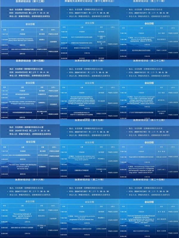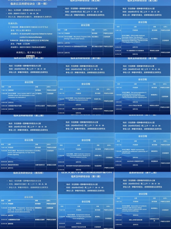 每周的医教研早鸟会由郭卉副院长牵头,尹晓然副主任主持,由科研和临床两部分内容组成。科研部分讲座每周由一名肿瘤或其他专业研究生进行高水平SCI文献深度解读,挖掘科学问题,从实验设计、数据解读、论点剖析等多角度进行讨论。临床部分讲座每周由一名临床医师进行临床问题的专题归纳。举办至今,除了肿瘤领域相关专题外,我科还邀请了包括影像科、心内科、急诊科、教务部等骨干医师进行专题培训。这些专题讲座的开设,不仅展示了我科的学术风采、彰显了科室的医疗素养,更是青年医师们汲取知识、锤炼技能的宝贵殿堂。