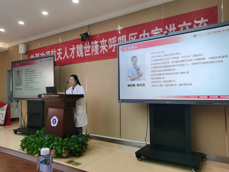 会议由呼吸与危重症医学科党支部书记杨侠教授主持,她首先介绍了两个支部的基本情况,并着重向与会人员介绍了本次宣讲活动主讲人魏世隆研究员简历。魏世隆研究员,主要从事微小卫星总体技术研究工作,深圳市五一劳动奖章获得者,自小立志为航天事业添砖加瓦,近十年攻克多项技术难题,参与完成国家级课题研究,在航天设计领域成绩显著。希望大家通过本次活动深刻感悟航天精神和共产党人的初心使命,以航天人为榜样,传承弘扬好中国共产党人的精神谱系,坚持爱党爱国的忠诚底色,坚持勇攀科技高峰的志气锐气,在日常学习工作中奋发向上积极进取。