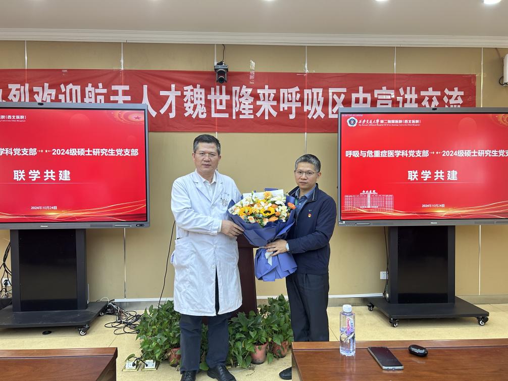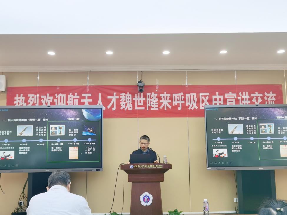 为加强支部建设,不断激发科室党员的爱国情怀和使命担当,促进职工与学生支部联合互动,呼吸与危重症医学科党支部与2024级硕士研究生党支部于2024年10月24日举办联学共建活动。本次活动以“学习航天精神 铸就医学辉煌”为主题,特邀中国航天科技集团魏世隆研究员进行宣讲,来自两个支部50余名党员积极参与互动,活动反响热烈。