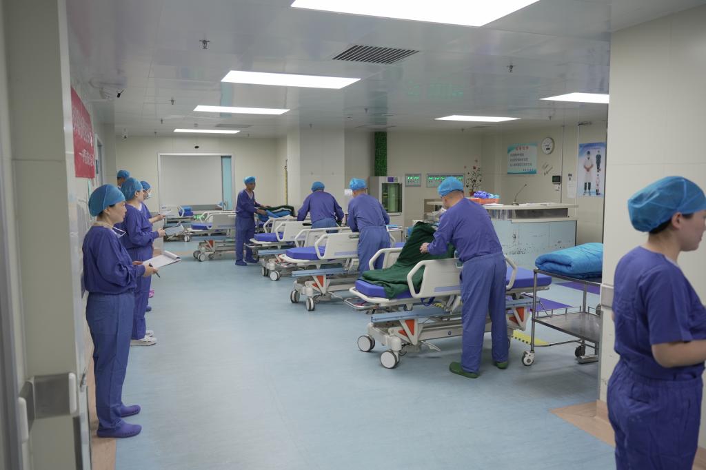 培训由护士长赵丽燕、副护士长古茹、刘雄涛,护士站负责人高明姬、肖小玲、舒粉宁,教学组井伟婷、王文等担任培训老师及评委。前期教学组制定了详尽的培训方案、操作流程、注意事项及评分标准等,对整场活动项目及细节做了充分斟酌和准备。培训伊始,护士长赵丽燕讲话,着重强调了此次培训的意义,对涉及护理员操作的所有项目内容进行了规范化要求与讲解,她指出准确规范的转运交接工作,对于保障手术患者安全以及提升患者就医体验起着重要的作用。此次培训涵盖五大核心模块:转运床单元的规范整理;手术患者转运交接(护理员到病区交接患者流程及核对内容,护理员到手术室交接流程及核对内容,送患者返回病区或ICU流程及核对内容);转运工具的规范选择和安全使用,路途转运要点及注意事项;转运中沟通技巧;让全体护理员“以患者身份,从患者视角”扮演患者做共情体验。