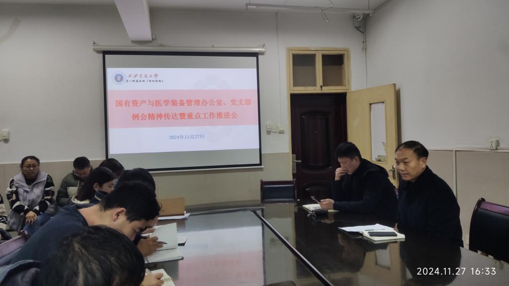 2024年11月27日下午,医院国有资产与医学装备管理办公室(以下简称国装办)在国装办二楼会议室召开重点工作推进会,国装办全体30余人参会,会议由国装办主任兼党支部书记叶泽宇主持。