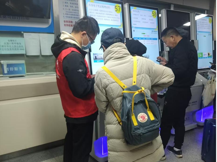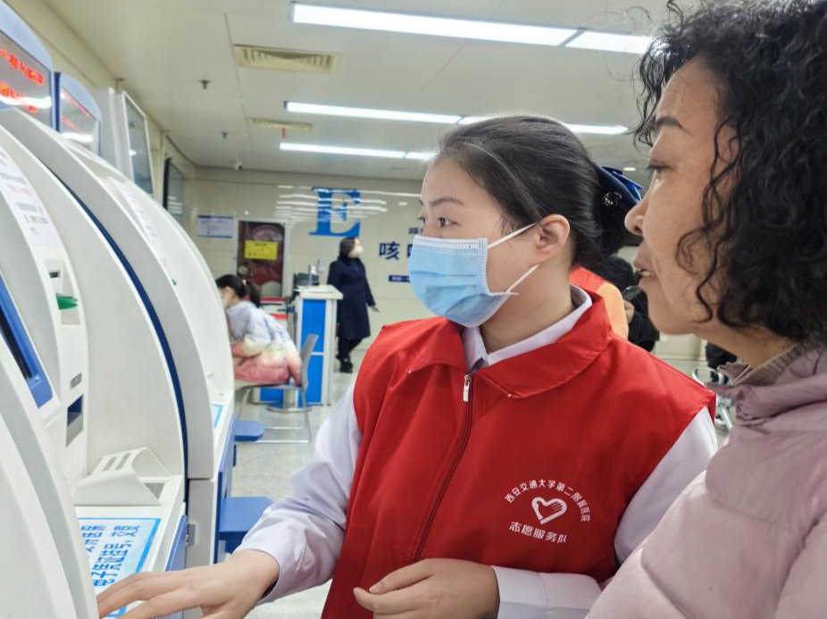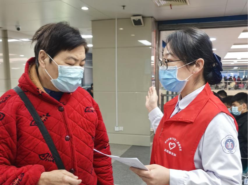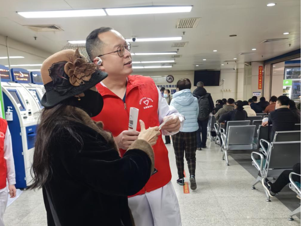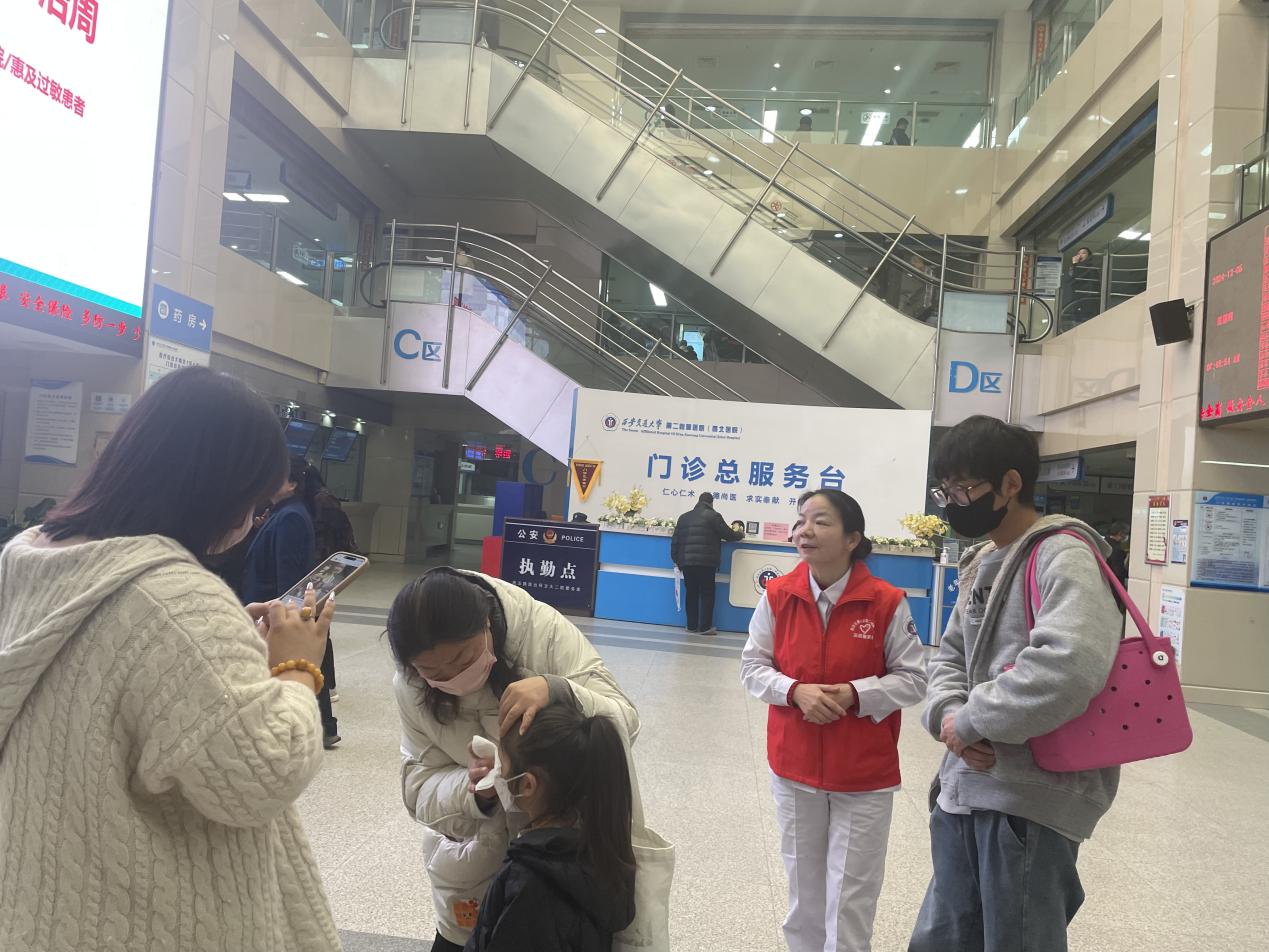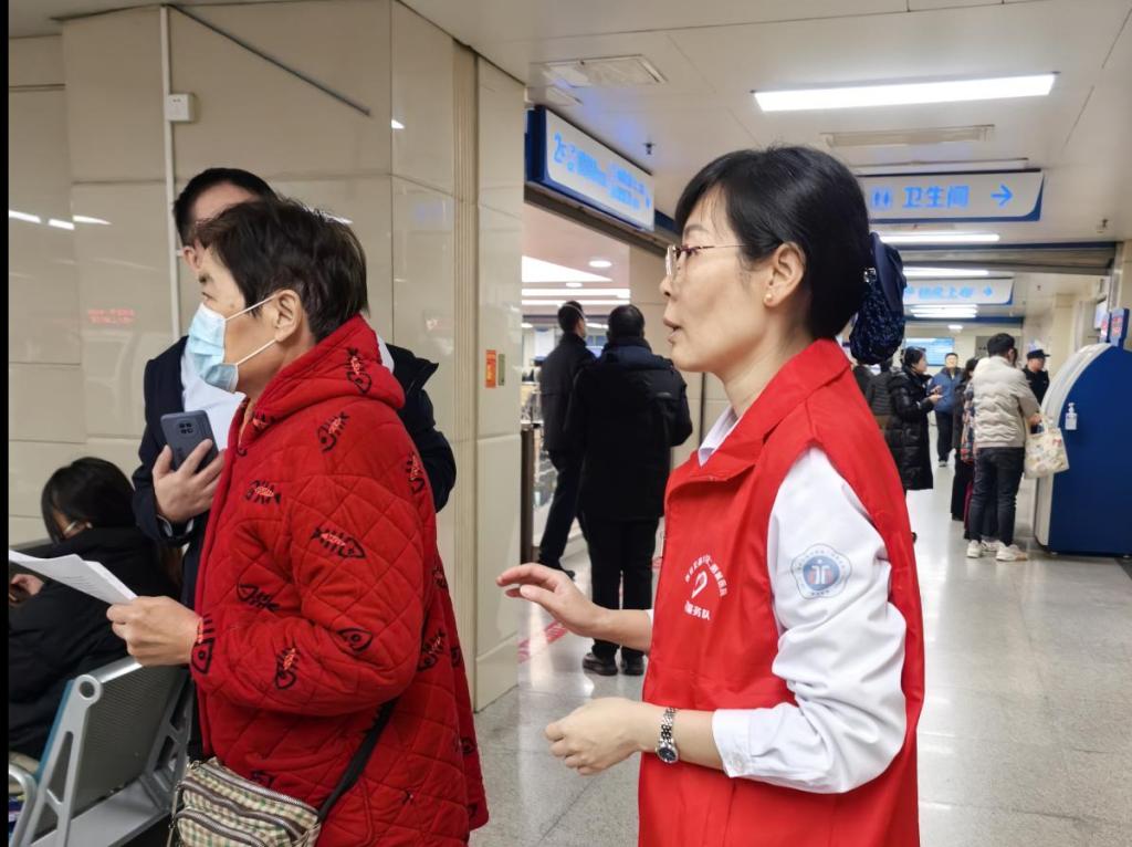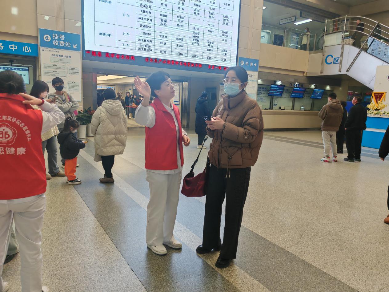 12月5日清早7点半,党员志愿者们来到门诊大厅,身着统一的志愿者服装,迅速投入到各自的岗位中。在导诊台,志愿者们耐心地为患者解答疑问,指引路线,帮助患者顺利挂号、取号,并细心告知就诊流程和注意事项。面对一些对医院环境陌生、满脸焦虑的患者,志愿者们用温和的话语和亲切的笑容给予安慰与鼓励,使其情绪逐渐稳定。