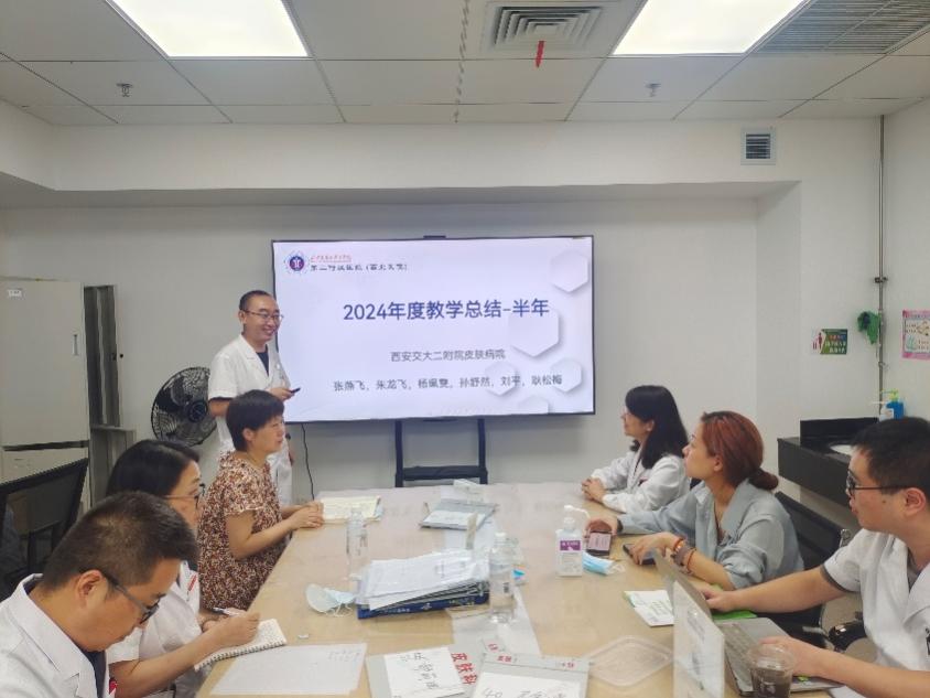 张燕飞老师首先汇报和总结了皮肤科上半年各项教学工作,包括规培轮转、教学小讲课,教学查房,教学病例讨论、实操培训等各类教学活动开展。教辅孙舒然老师,朱龙飞老师及杨珮雯老师各自对负责教学内容进行补充。