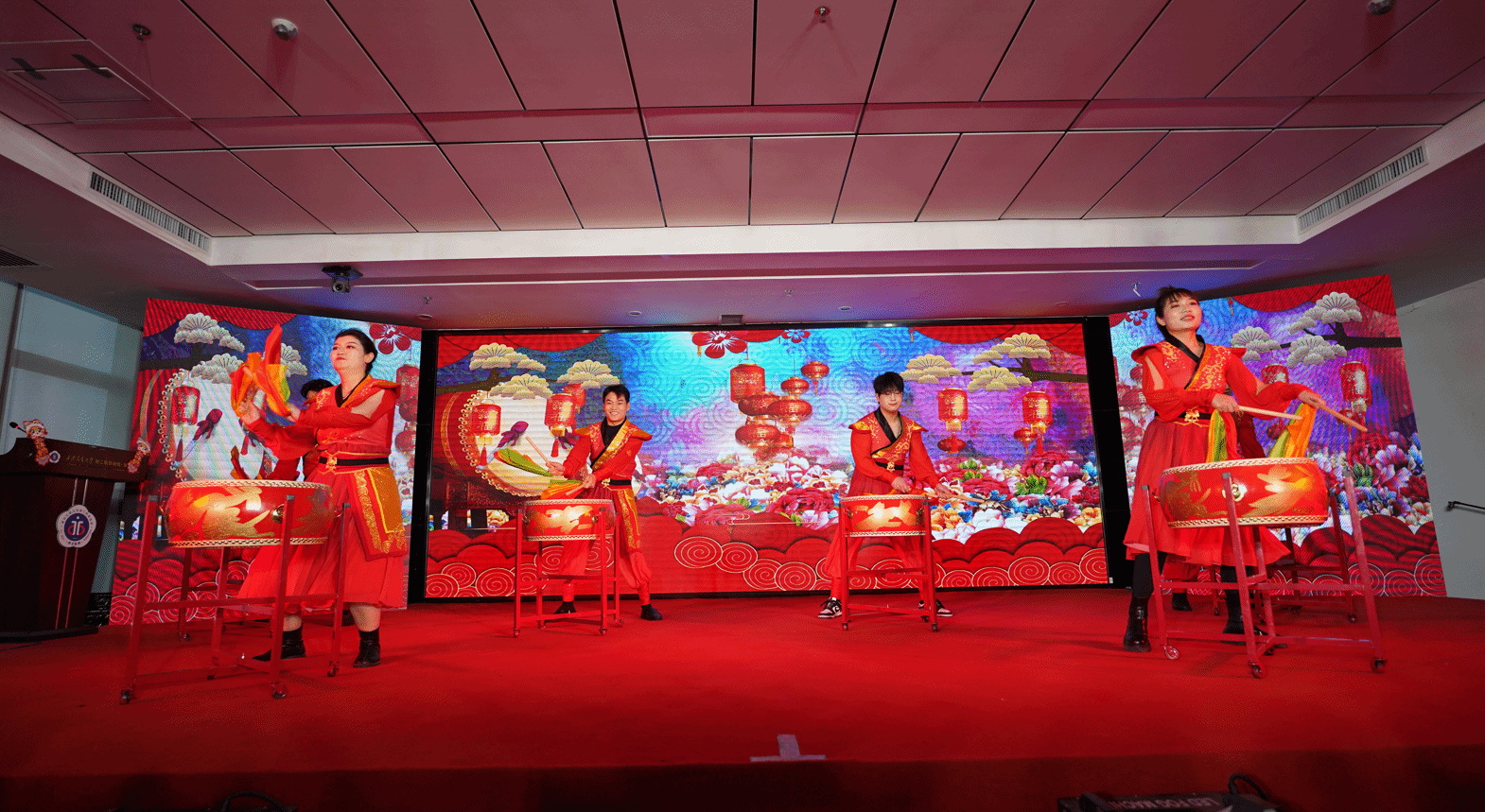 晚会以一段振奋人心的《击鼓舞》启幕,鼓手们身着华丽战袍,以激昂的鼓点奠定了晚会的基调。在“追光”VCR的引领下,由蒋伟副主任带队的四位主持人闪亮登场,正式拉开了晚会序幕。白鸿远医生以一种风趣而机智的口吻逐一引介了与会的诸位教授,其中包括远隔千山万水、来自西藏阿里地区的万招飞医生,新疆乌鲁木齐的韩婕医生,以及远在非洲马拉维的胡艳超医生,他们虽不能亲临现场,却通过深情的话语传递了满满的祝福与敬意。随后,白鸿远医生的话语轻轻一转,带着大家共同回溯了那段刻骨铭心的时光——心内科的医护人员在武汉新冠疫情肆虐之初,如何以无畏的勇气与坚定的信念,书写下一段段感人至深的抗疫篇章。