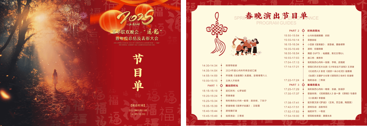 随着2024年的尾声渐近,我们满怀期待地迎来了充满挑战的2025年。1月3日下午,心血管内科在大明宫院区14楼举办了一场盛大的晚会,共庆过去一年的成就,展望未来的辉煌。郑强荪院长以热情洋溢的致辞拉开了晚会序幕,随后,邓捷主任和王蓉护士长对心血管内科在2024年所取得的医疗和护理成绩给予了高度评价,并对全体人员的辛勤付出表示感谢,勉励大家在新的一年里再创佳绩。