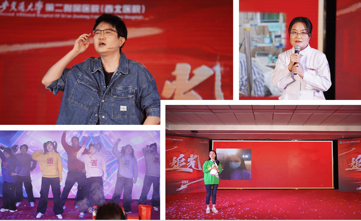 才艺展示环节,各位领导各展所长。王洪涛主任演唱《少年壮志不言愁》,唱出了医护人员的豪情与担当;张岩副主任与孙阳医生钢琴弹唱《无名的人》;寇慧娟副主任演唱《送你一条小红花》,激励年轻一代医护人员奋勇前行。王蓉护士长率领的七仙女护士长天团合唱《如愿》,歌声悠扬动听,感动现场观众。最后,邓捷主任带领三位副主任表演了《领导的三句半》,以诙谐幽默的歌词展现医护人员的智慧与风趣。