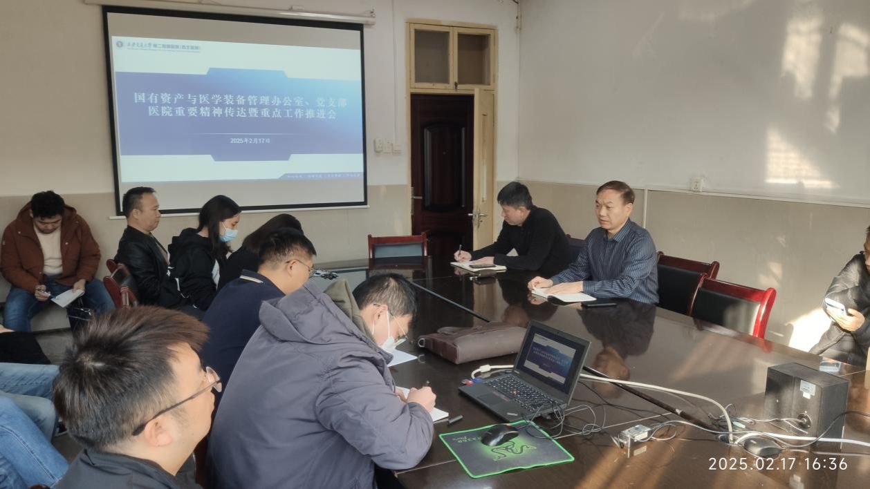 2025年2月17日下午4点30分,医院国有资产与医学装备管理办公室(以下简称国装办)召开医院重点会议精神传达暨重点工作推进会,为新一年工作谋篇布局。本次会议国装办全体成员30余人参加,国装办党支部书记、主任叶泽宇主持。