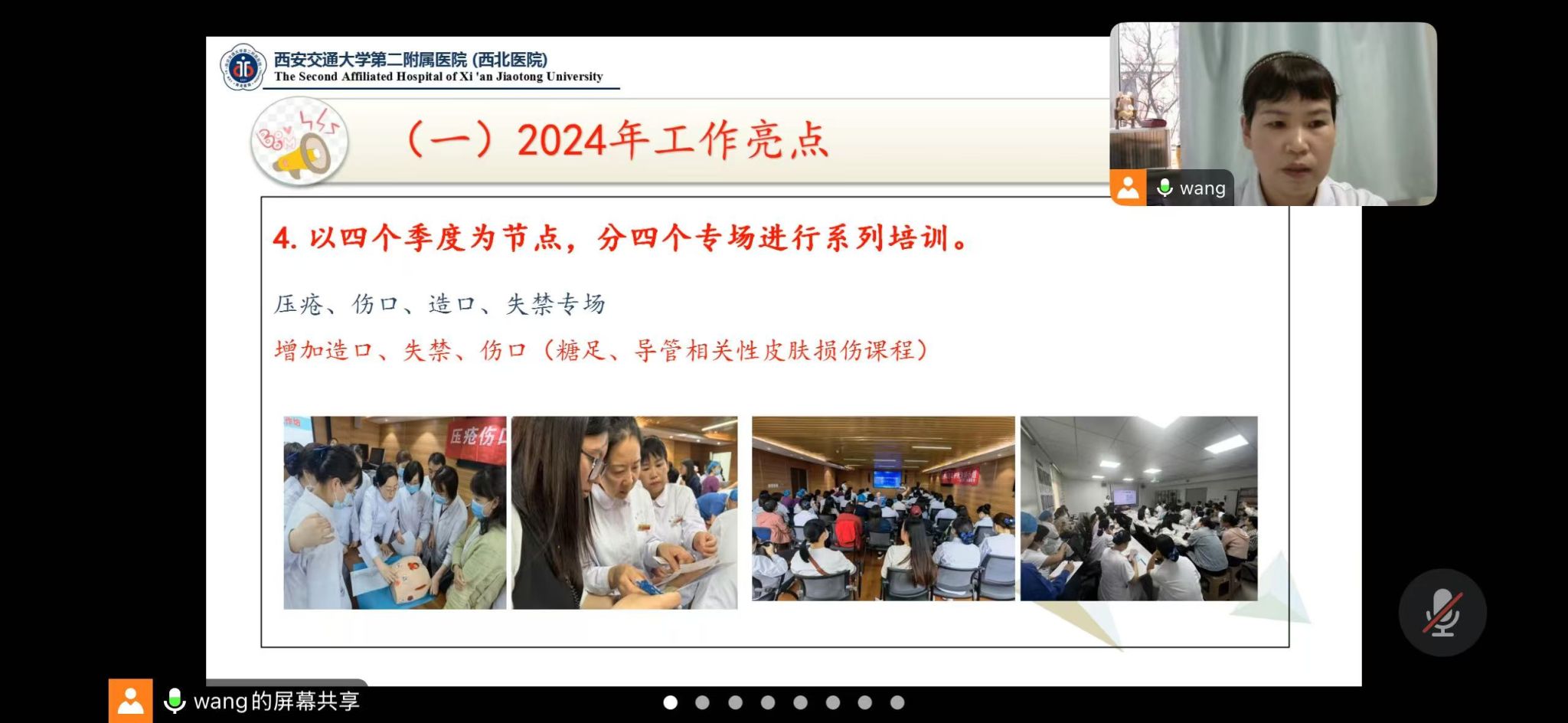 首先由王金娟组长为我们分享了2024年小组工作总结暨2025年小组工作展望,在 2024 年小组共举办线上和线下会议近 20 次,采用线上结合线下、理论结合实操的形式。亮点是以四个季度为时间节点,分压疮、伤口、造口、失禁四个专场进行系列培训,专场采用理论结合实操;开展压力性损伤、造口工作坊;以问卷星app形式进行压力性损伤患者的横断面调查、护理人员压疮知识问卷调查、压疮质量专项检查等工作。并且和大家一起分享了小组2025年的工作计划,简述了工作安排,2025年拟在护理部的指导下进行一次全院护理人员科普/授课竞赛。希望小组所有成员继续努力,凝心聚力,发挥大家的力量和作用。