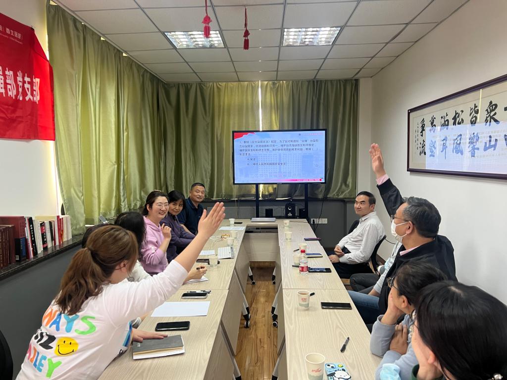 2024年4月10日中午,皮肤杂志编辑部党支部联合科研部党支部共同进行“总体国家安全观•创新引领10周年”主题党日活动。主题党日以知识竞赛的形式开展,以赛促学,以学促行。两个部门主管院领导郭卉副院长在线致辞,党办赵振峰主任到场指导,两个支部书记马慧群主任和夏育民主任分别带队,共同参与知识竞答。
