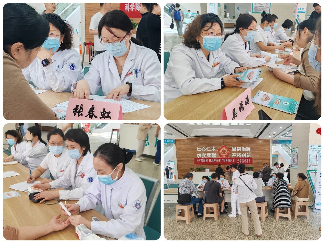 义诊现场,由内分泌代谢科张春虹教授、徐静教授、吴娟娟医师组成的义诊专家团队为市民详细解读高尿酸血症的成因,危害及预防措施。并通过询问病史、查看病历资料、查体等形式为现场民众答疑解惑。张琳副护士长带领的护理团队与科室医技团队为前来咨询的患者监测血压、血尿酸,同时为广大群众普及高尿酸疾病的饮食、用药,预防等健康知识,从而促进民众健康素养的提升。