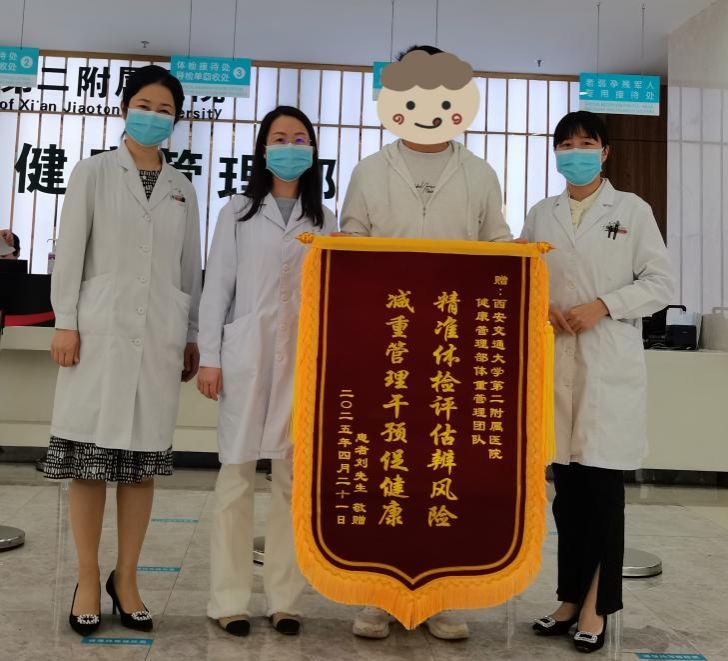 其中的典型案例是这位送锦旗的刘先生。该客户是一位小基数腹型肥胖合并中度脂肪肝患者。小基数腹型肥胖,不同于常规减重,需在有限体重空间内精准干预,而脂肪肝的逆转更考验综合管理能力。在刘先生选择健康管理部减重管理团队后,团队为他量身定制了科学的饮食计划,精确计算每一份食物的热量与营养配比,既保证身体所需,又逐步消耗多余脂肪;营养师每日跟进生活习惯,从睡眠质量改善到压力情绪疏导,全方位重塑健康生活方式。每一次的沟通与交流,每一个健康建议的落实,都凝聚着我们团队的专业与用心,更饱含着他对恢复健康的坚定信念与不懈坚持。