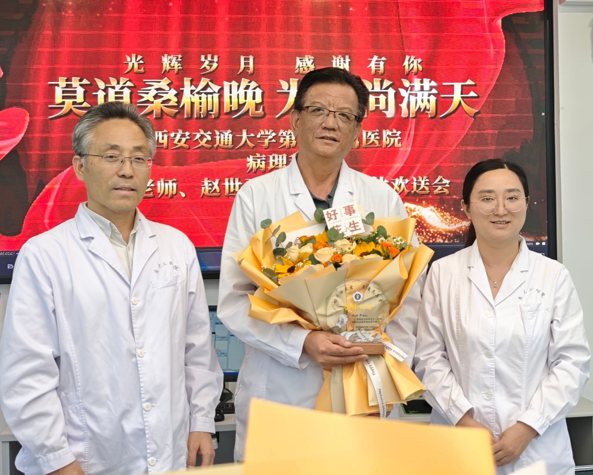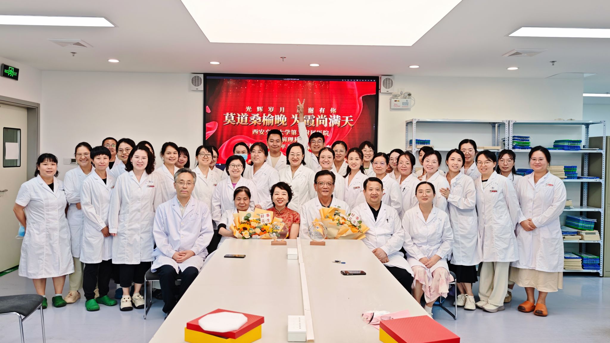 为感谢退休员工为二院病理科所做的贡献,增强员工归属感与荣誉感,2025年7月29日下午,病理科全体人员齐聚一堂,为2025年度退休的黄莺老师和赵世平老师举办了以“莫道桑榆晚,为霞尚满天”为主题的光荣退休仪式。