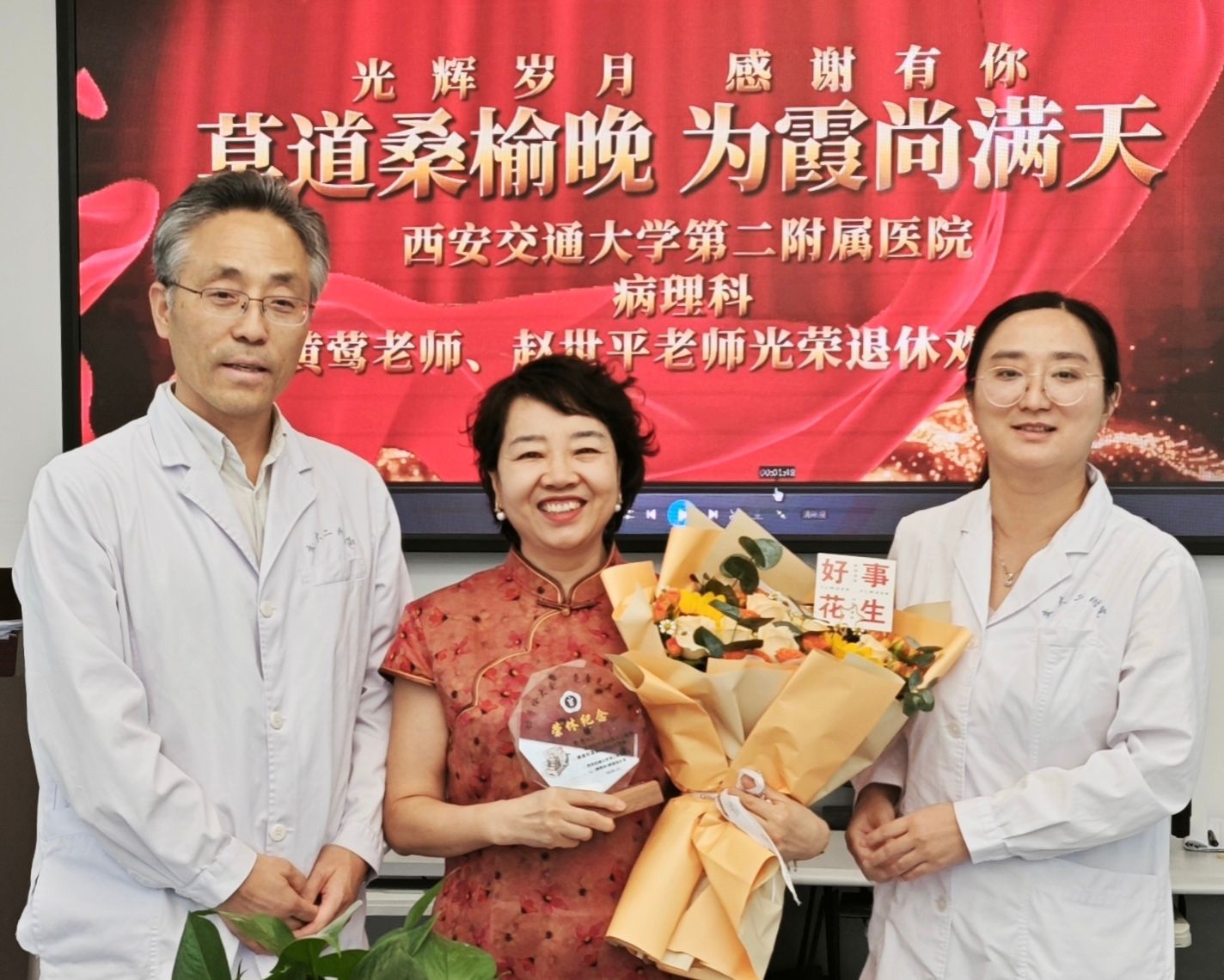 荣退仪式在贾少怡和科室其他员工精心制作的纪念视频中拉开序幕。视频短片记录了黄莺老师和赵世平老师这四十年来如一日地在病理技术岗位的坚守和奋斗的足迹——从青丝如墨、满怀热忱踏入技术室,到专注于病理操作技能、参与学术会议、进行学术授课和示教操作。如今华发如雪、功成身退,他们不仅将芳华的青春和人生最宝贵的40年毫无保留地奉献给了西安交大二附院病理科,更是作为技艺精湛的病理技术专家和甘为人梯病理技术领路人,通过日复一日的言传身教和手把手式的一一带教,滋养了一代代病理技术新人的茁壮成长,并为四十年来二院病理从普通光学显微镜时代,跨越免疫组化时代发展的分子病理时代做出了重要贡献。