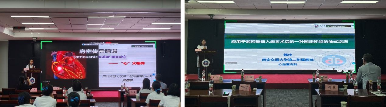 在青年教师展示环节,心内科四位优秀医师代表依次登台。邓伏雪医师以“以智为光,基能并举——融合式培养卓越精尖医学人才”为题,探讨数智技术支持下的课程创新;耿洁医师通过一例“屋漏偏逢连夜雨——心衰的综合治疗”的复杂病例,展示了扎实的临床授课能力;梁西颖医师以“三度房室传导阻滞中的科技自强与医者使命”为题,将技术发展与医者责任融入思政教育,深刻而动情;魏佳医师则从临床实际问题出发,介绍了“应用于起搏器植入患者术后的一种固定沙袋的袖式坎肩”的创新设计,体现出临床与材料应用的紧密结合。