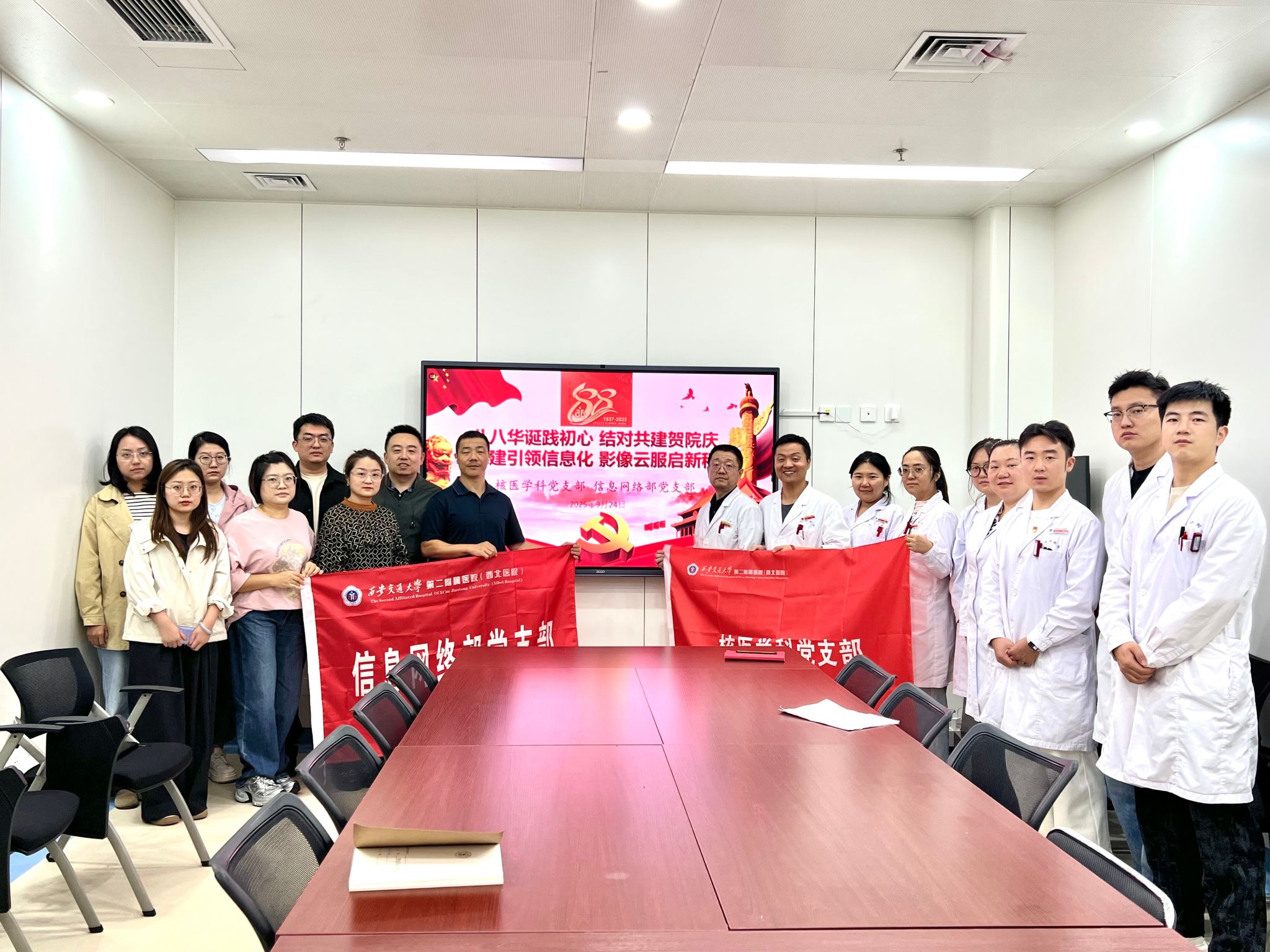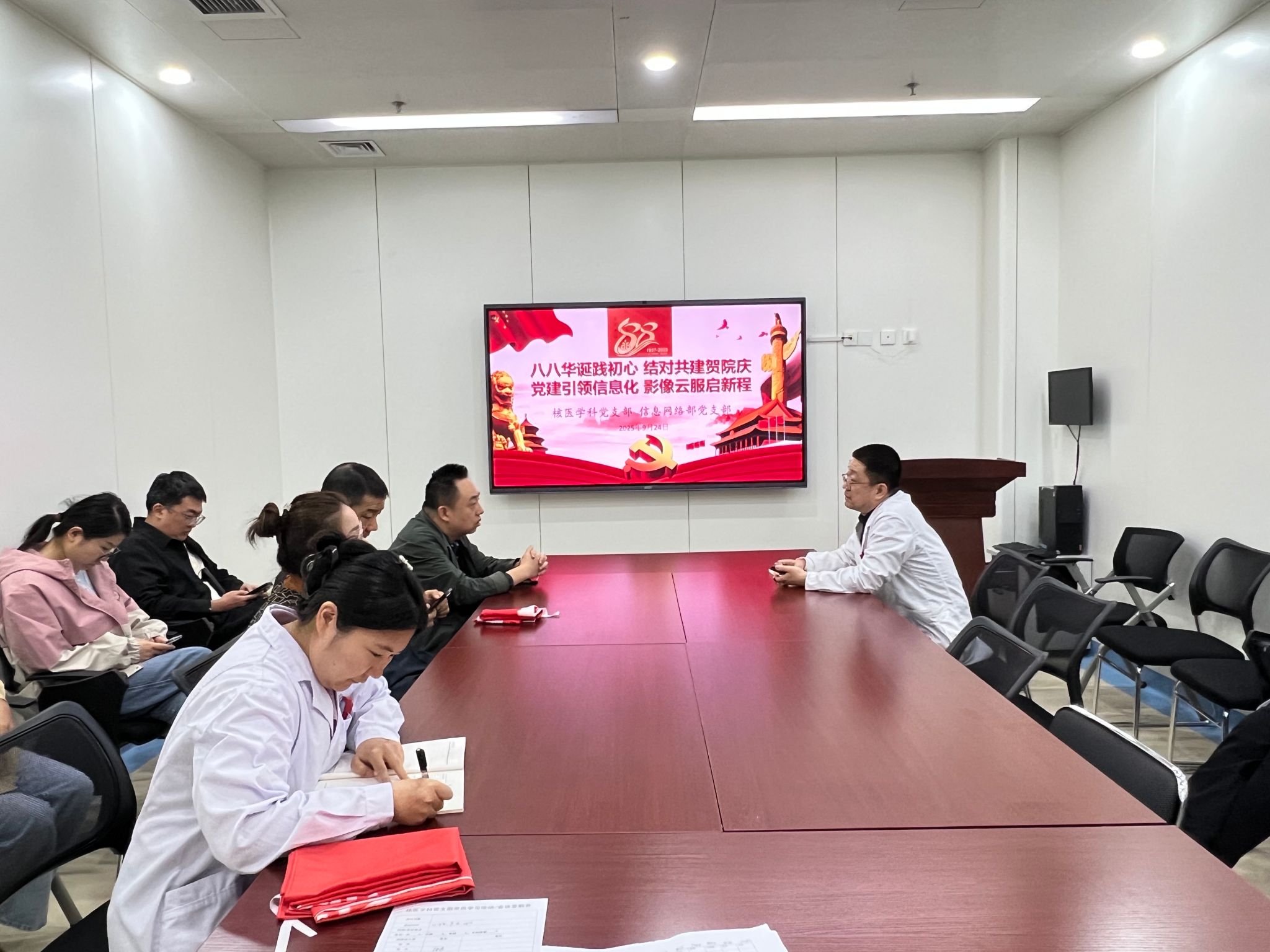9月24日,为响应医院“八八华诞践初心”系列活动号召,推动党建与业务深度融合,核医学科党支部与信息科党支部围绕“八八华诞践初心,结队共建贺院庆;党建引领信息化,影像云服启新程”主题,举办了一场交流会议。此次会议聚焦电子病历评级工作,深度探讨日常信息网络相关问题,旨在提升医院信息化服务水平,以实际行动为医院88周年院庆献礼。